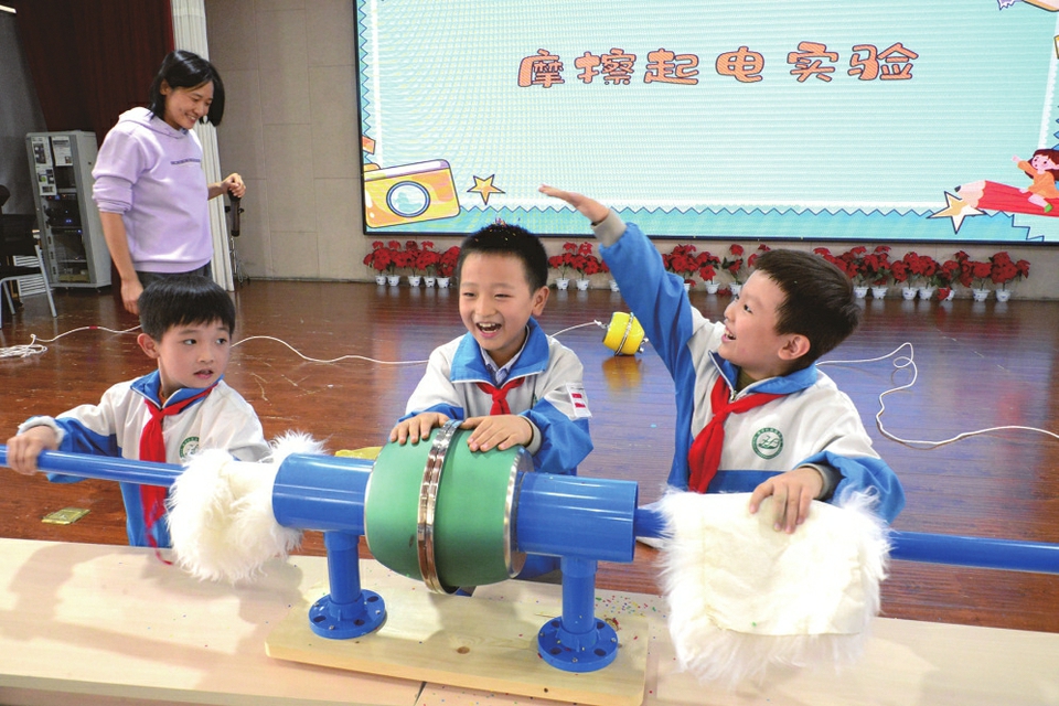 图为孩子们正在进行摩擦起电科学实验。记者张丽媛摄