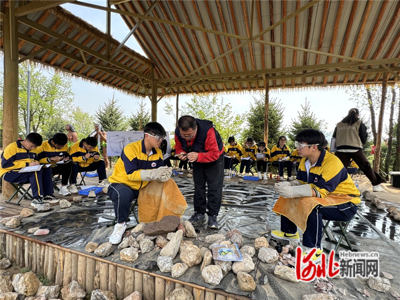 5月11日,在阳原县泥河湾国家考古遗址公园,参加研学活动的当地中学生正体验打制石器用品。魏国慧摄
